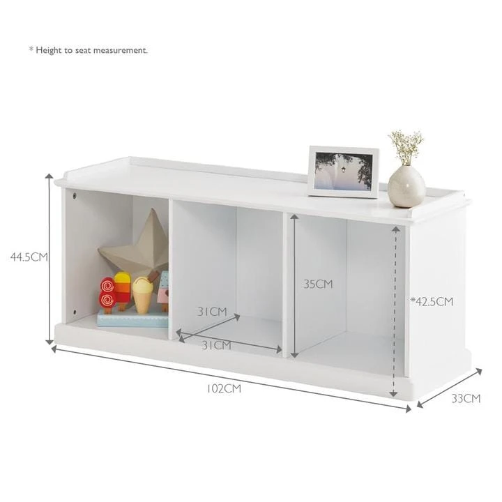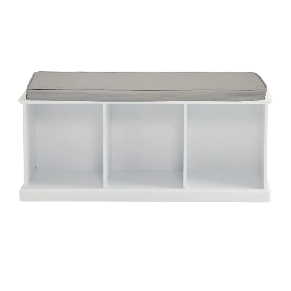 The storage bench is made from sturdy MDF and painted with a Bright White finish. The cushion features a 100% cotton cover and a polyester cushion pad. The removable cover is machine washable.