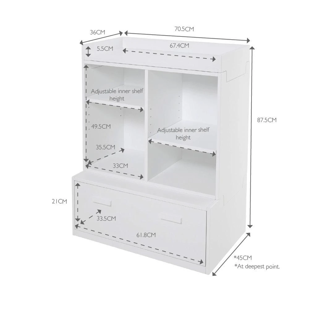 We’ve put together this combination of Alba storage pieces for a quick and easy storage solution; add more units or another set alongside if you need more space. Set 6 includes a Regular Toy Box Base featuring a drawer and a ledged shelf, and a Regular Divider Unit with two adjustable shelves.