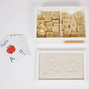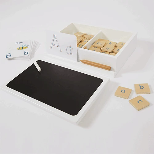 The box is made from smooth MDF with a Bright White finish; it has a chalkboard on the lid and a tray on the reverse for sand, flour, or grains. It comes with 52 wooden alphabet tiles (with upper case letters on one side and lower case on the reverse), 26 illustrated alphabet flashcards (with upper case and lower case letters on one side and letter formation guides on the reverse), and a wooden pencil. PLEASE NOTE: We do not supply sand or chalk with this toy.
