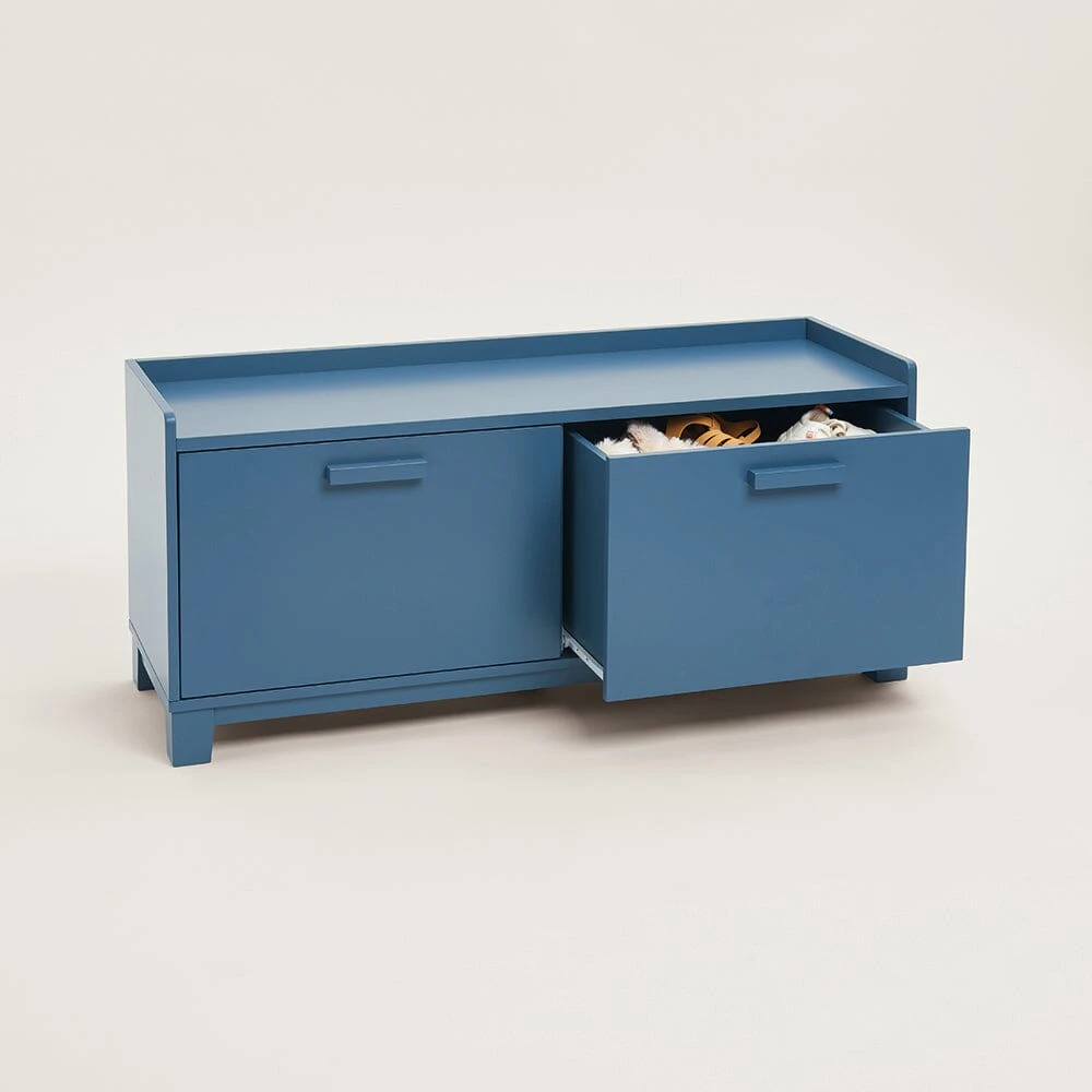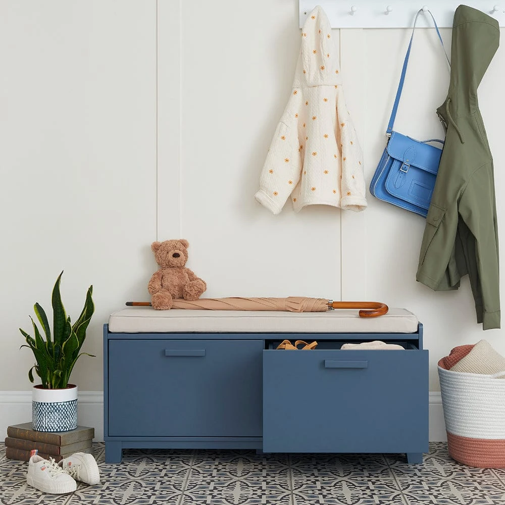 Streamline your hallway for smoother exits with this multifunctional storage bench. Part of our popular Blake range and now available in a limited edition Ocean Blue, the bench has two large drawers on smooth metal runners, which are perfect for hiding away shoes, bike helmets and more.