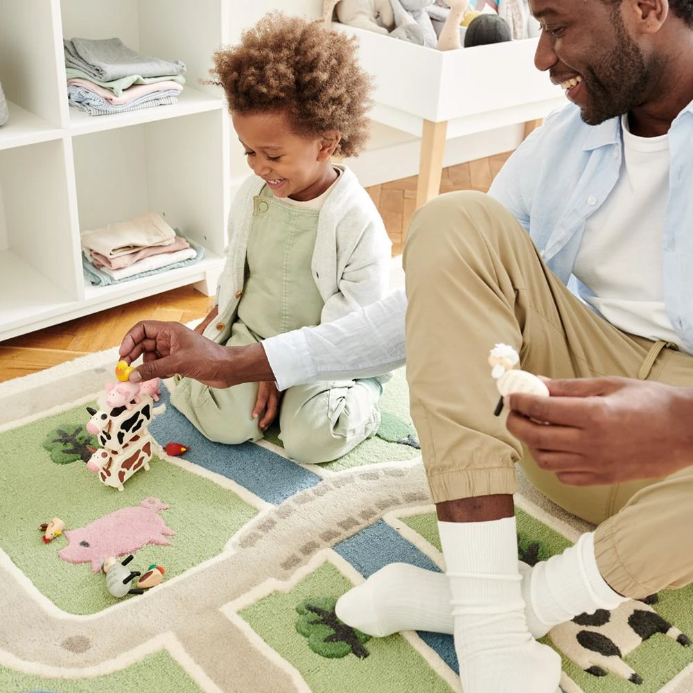 Not only is this children’s rug beautiful to look at and soft on little knees and tiny toes, it’s a fun place to play, too. Wheel tractors and cars around the winding paths and say hello to the happy farmyard animals as you pass on by. Children will love to use this rug as a cosy play mat.