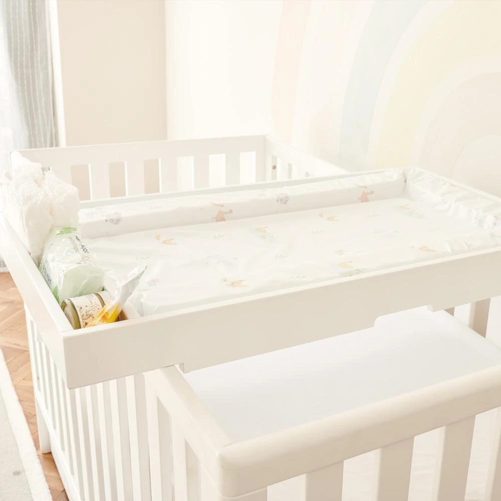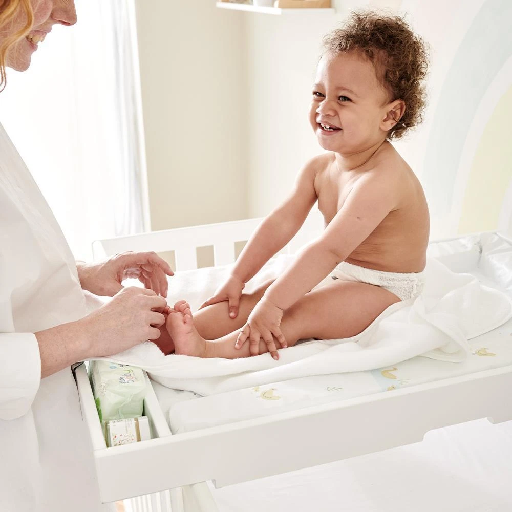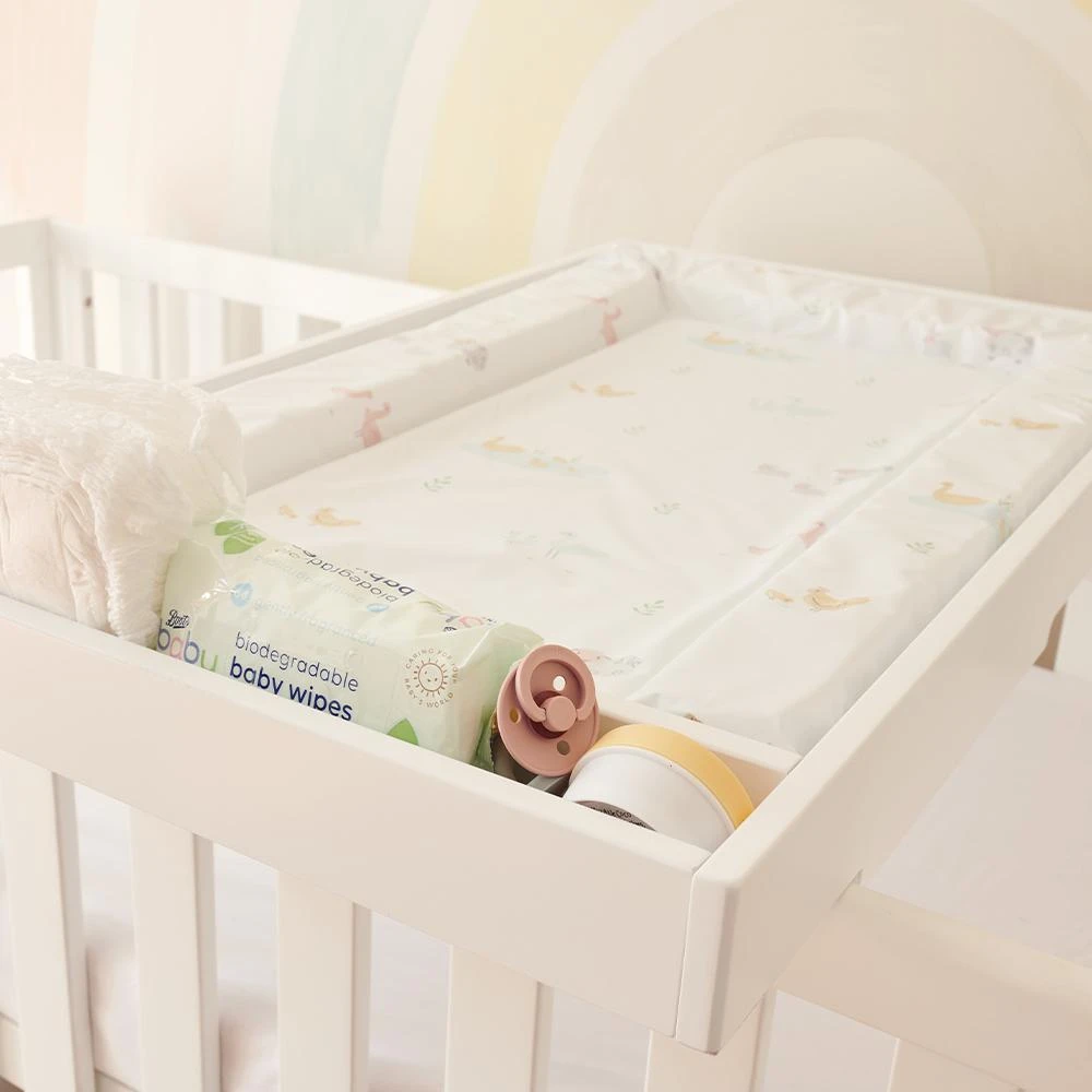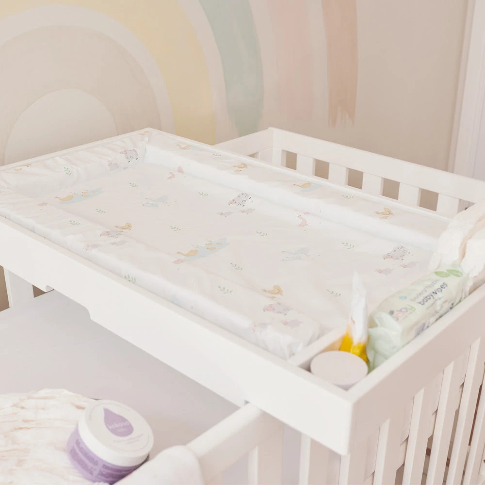 Here’s a clever addition to any nursery. This space-saving cot top changer slots easily and safely on to the Little Wren Cot Bed and provides the perfect height for parents to change their baby; the handy storage section keeps nappies, creams and other baby essentials within easy reach. It can be used from birth to 12 months or to a maximum weight of 11kgs. Team it up with our Woodland Animals by Ryn Frank or Day at the Farm Changing Mats.
