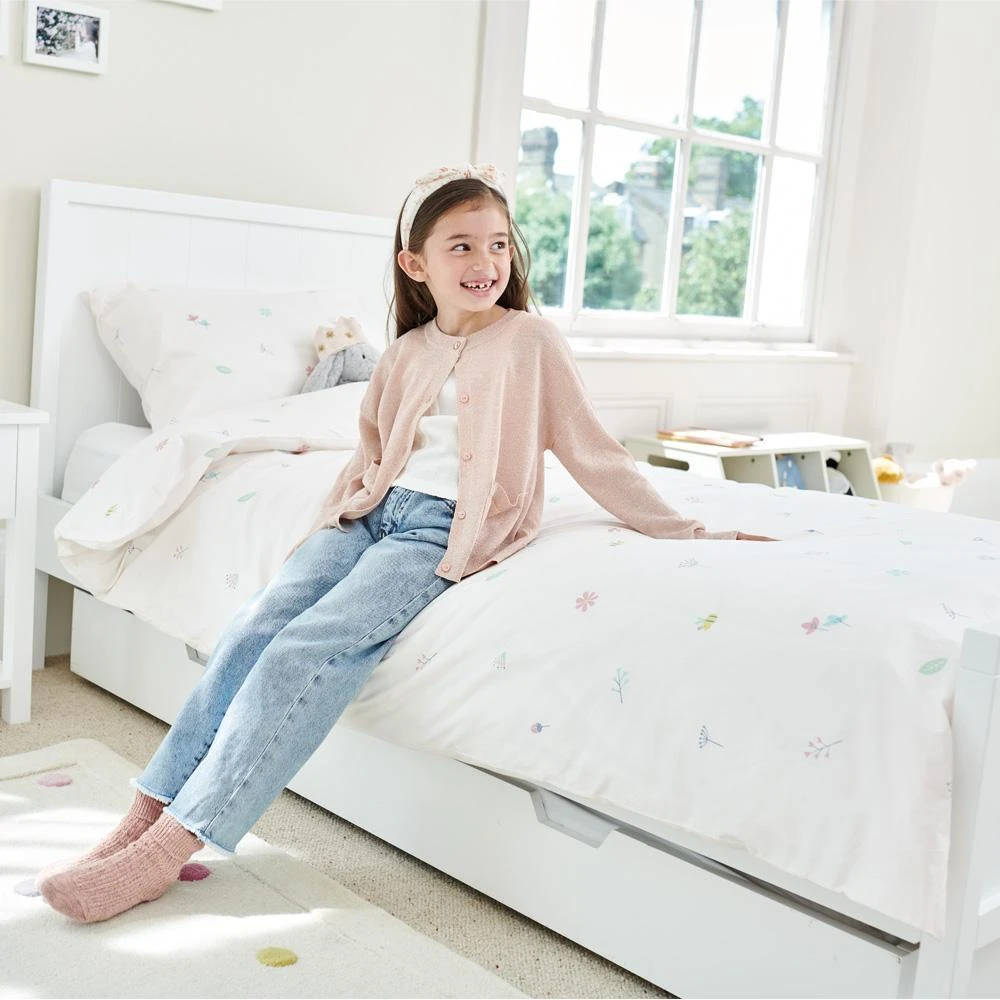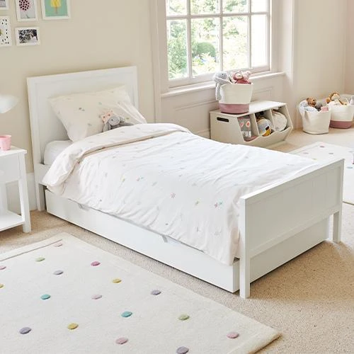Stylish and smart, this contemporary single bed is a great choice for children’s bedrooms. The classic tongue and groove detail offers a timeless touch while the white painted finish ensures it will suit your child’s bedroom for years to come. Team it up with a new set of our super soft Children’s Bedding.