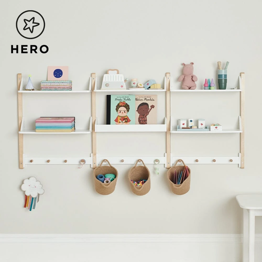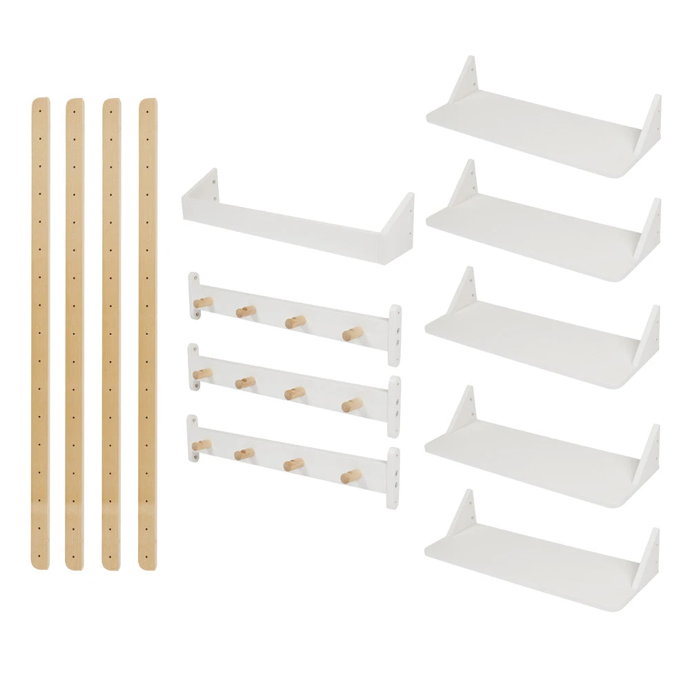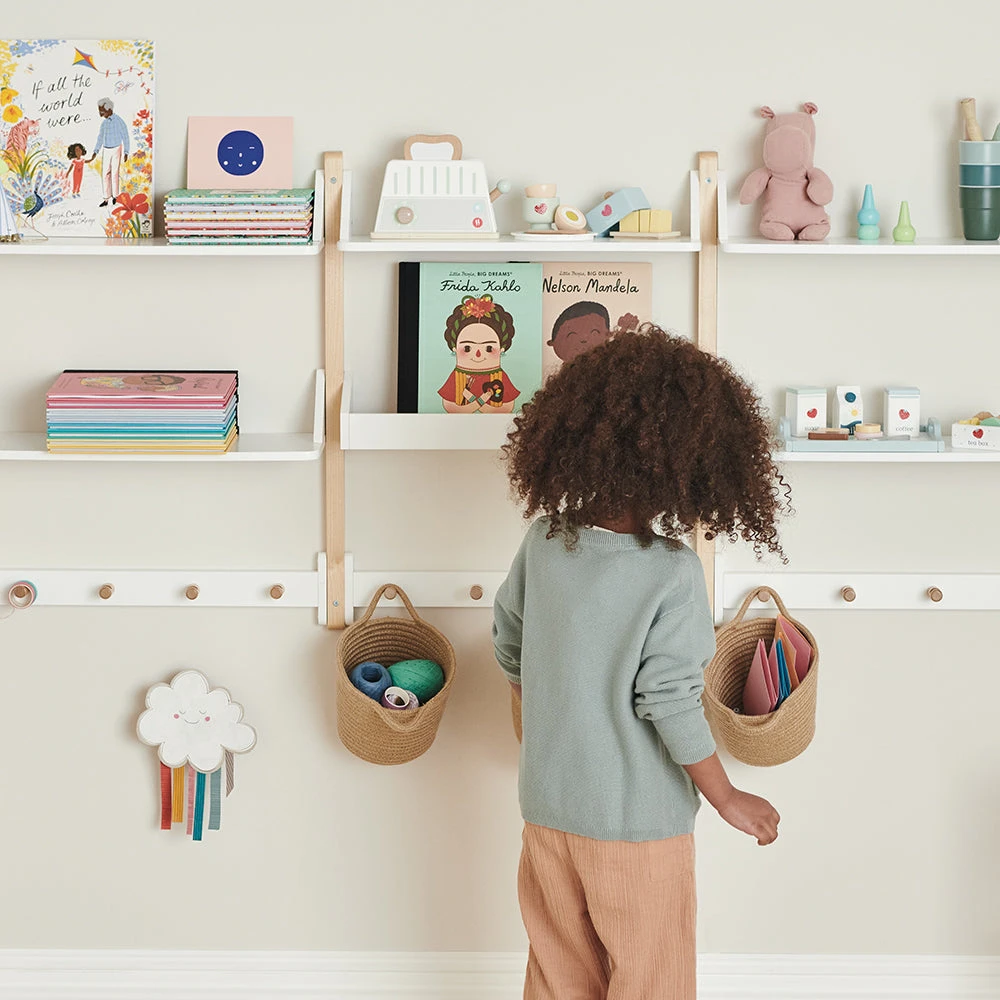 This set contains four wooden wall support, five shelves, three peg rails and one book ledge. Each individual component can be slotted at whatever height you fancy thanks to the pre-holed beech supports, and can be repositioned as necessary. Pssst our trio of mini storage baskets makes a stylish and functional add-on. Fill with odds and ends then hang them on the peg rails or pop them on one of the shelves. See the full range of options here.