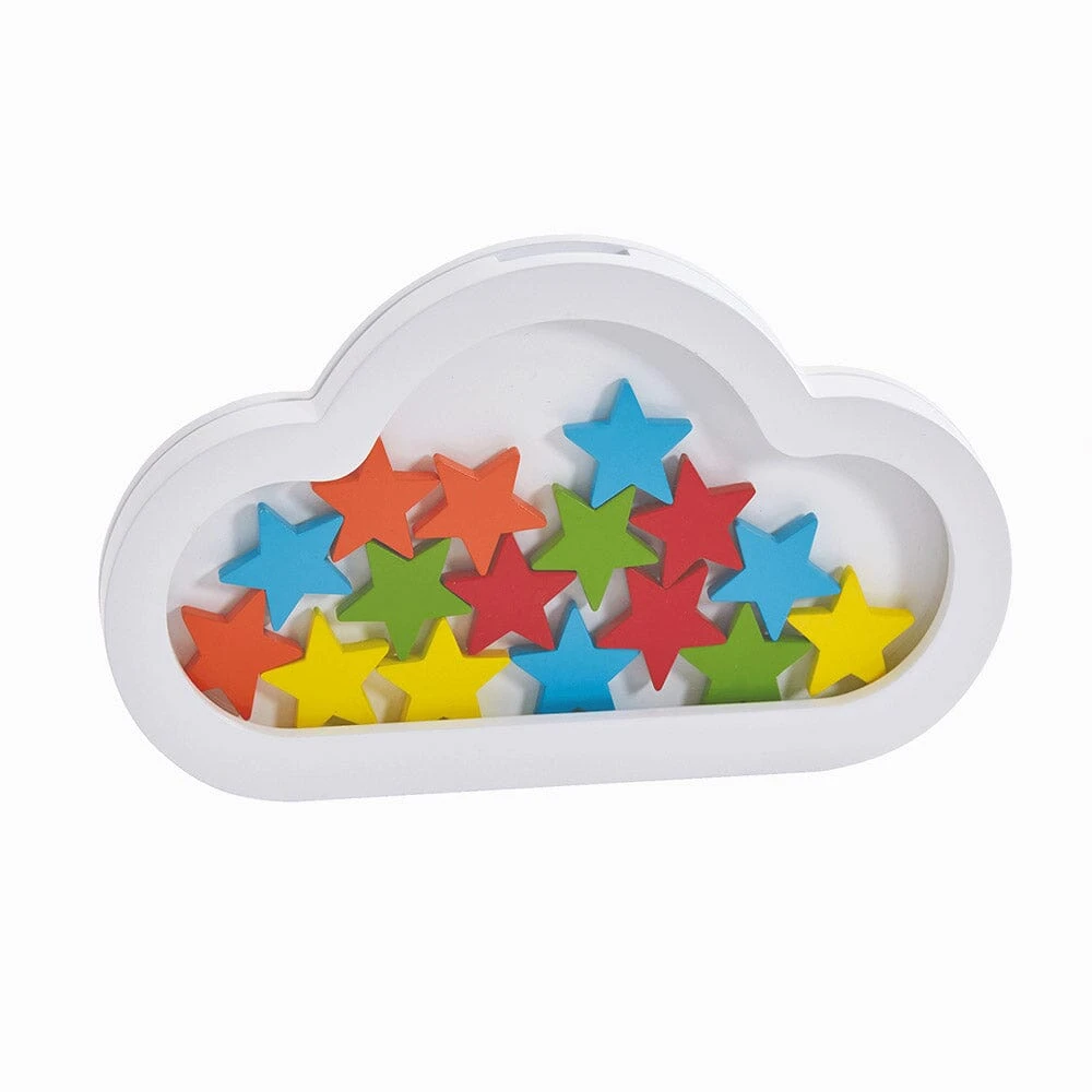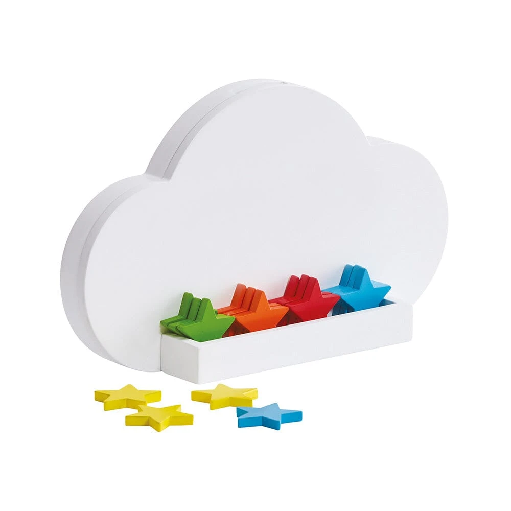 The wooden cloud box has a painted finish and acrylic safety glass. It comes with 16 wooden, multi-coloured stars and has a magnetic closure so once the cloud box is full you can easily get the stars out again. The stars can also be stored in the back compartment.