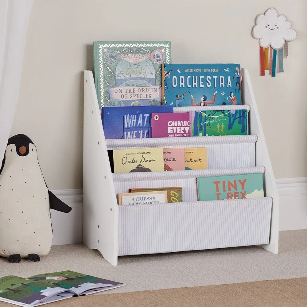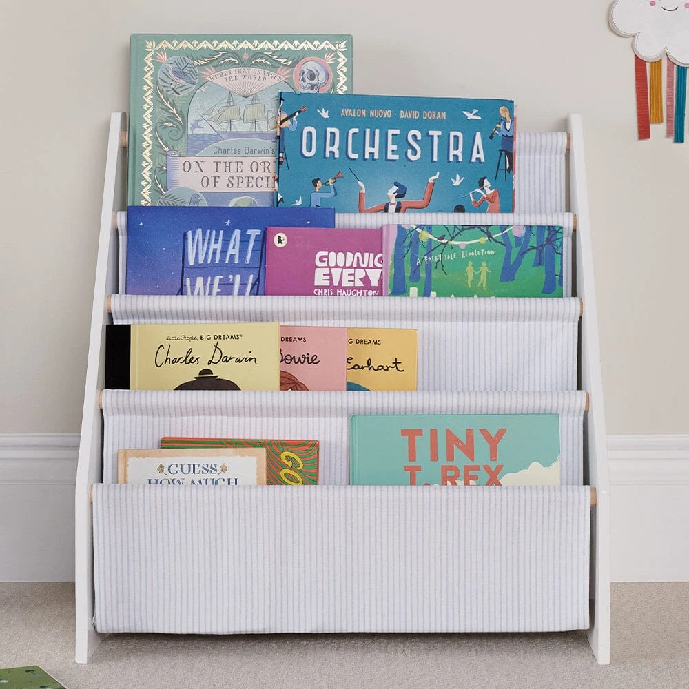 This super stylish and functional bookcase is a must-have for little bookworms. Its durable and washable canvas shelves keep their library of picture books tidy and perfectly within reach.