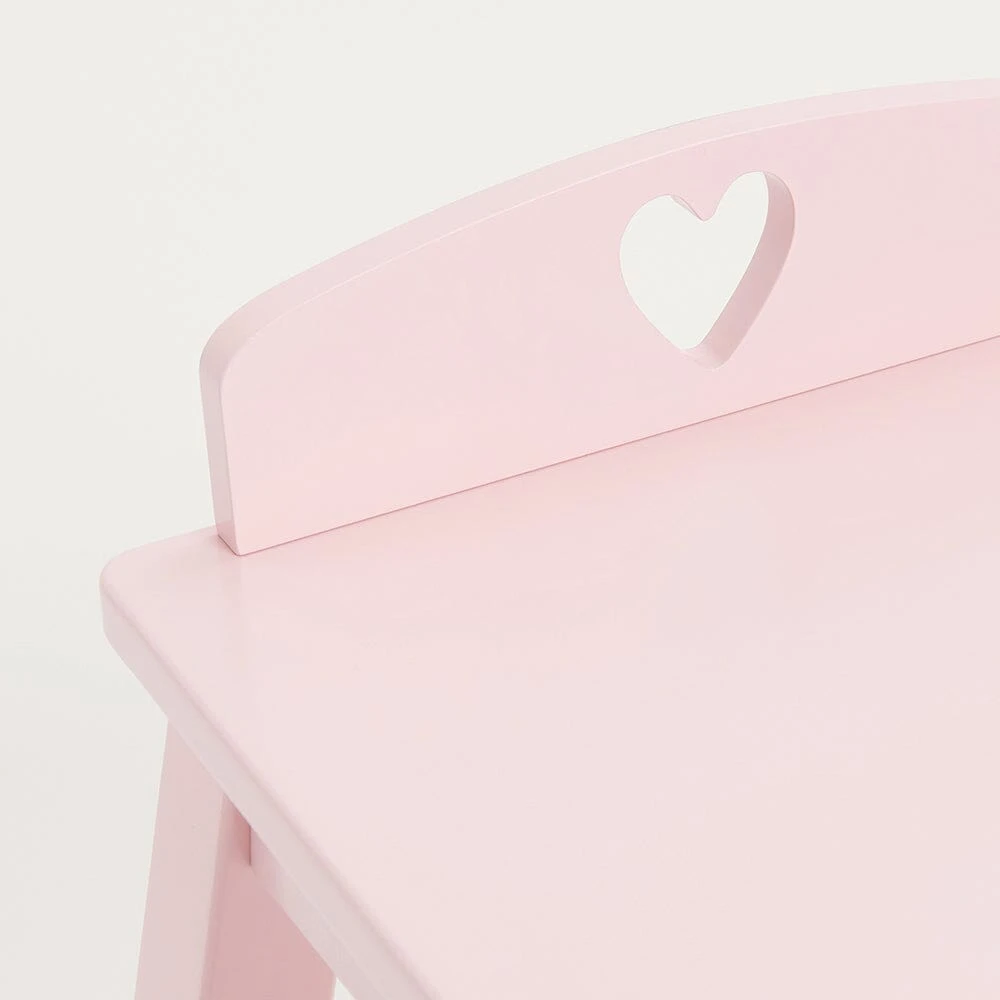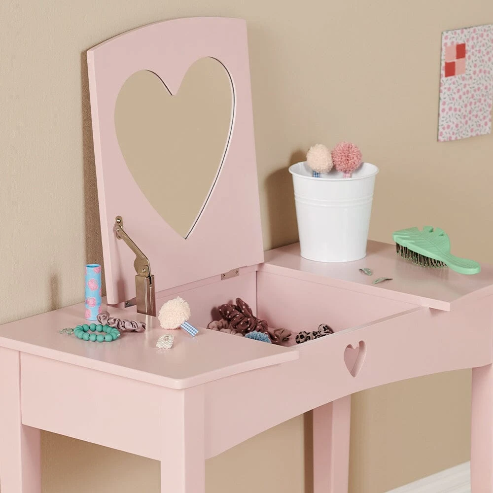 The table has a hidden storage area that’s perfect for squirrelling away hair accessories and gems, and a heart-shaped mirror made from acrylic safety glass. There’s a safety hinge on the lift-up lid to keep little fingers safe too.
