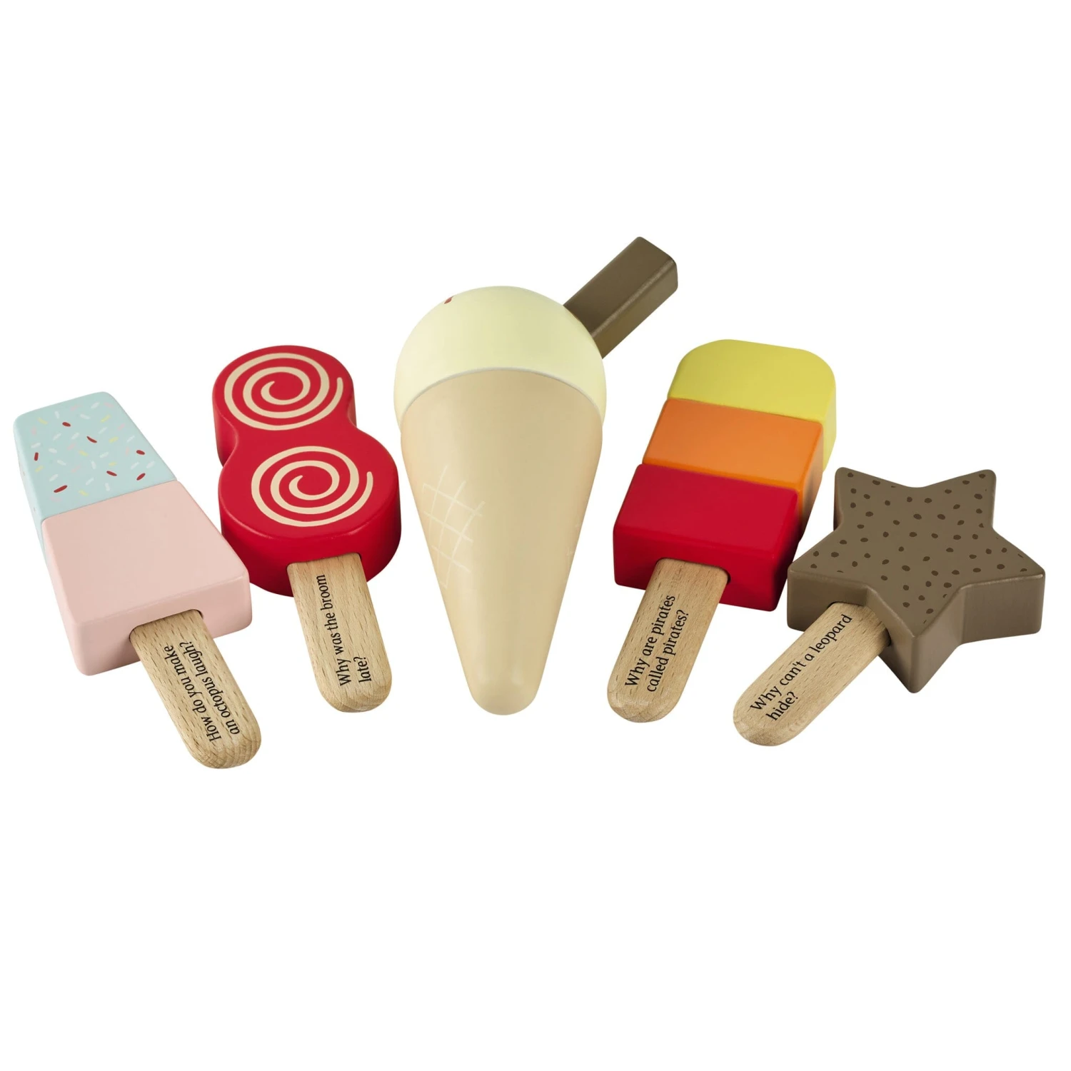 It’s made of smooth painted wood and includes four lollies, one ice cream cone complete with flake (not removable) and a wooden storage stand.